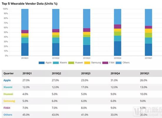 2019年Q1,排名前五的可穿戴廠商依次為蘋果、小米、華為、三星和Fitbit